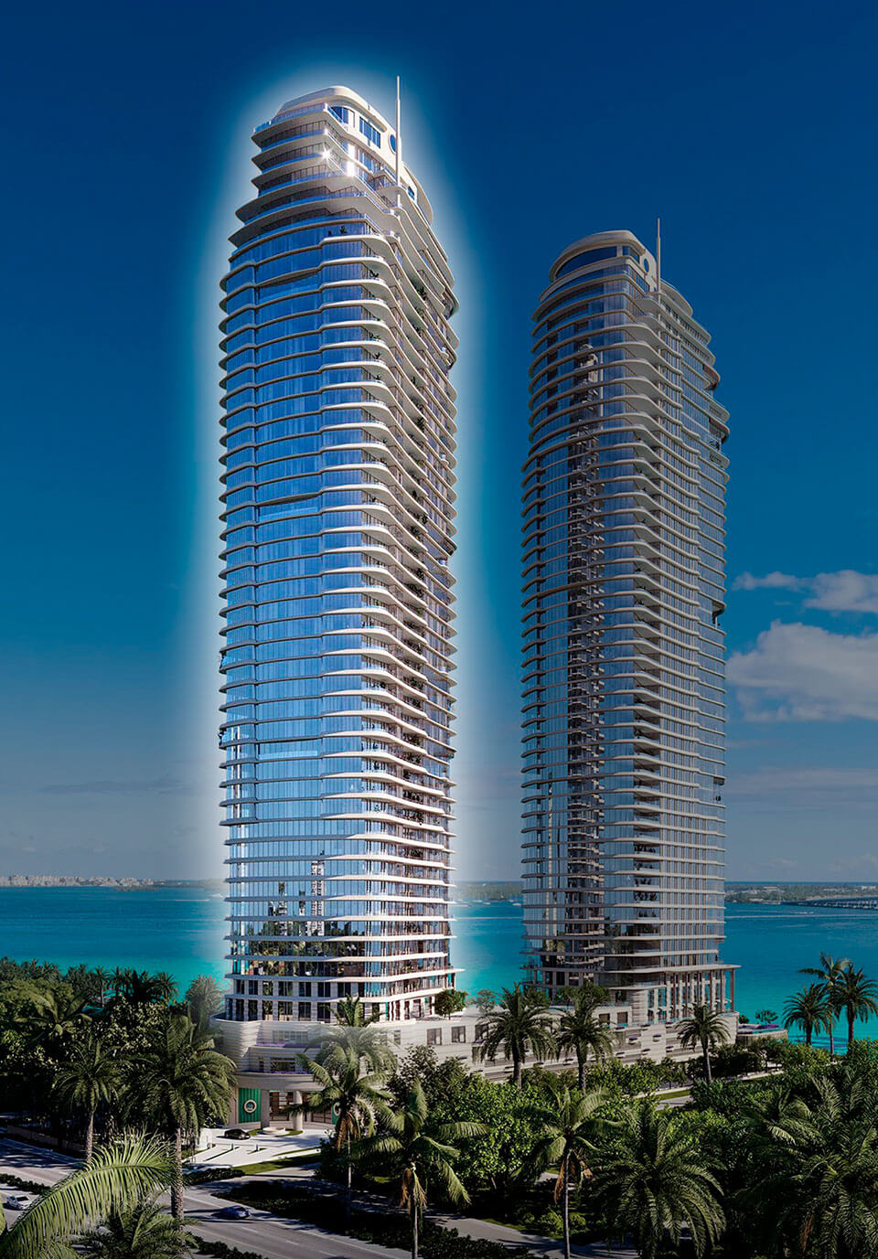 46 stories featuring 183 residences, including penthouses and sky villas A collection of one-to-seven-bedroom homes measuring from 1,400-to-8,000 SF Unobstructed views of the Miami skyline, Biscayne Bay and the Atlantic Ocean Porte-cochere with commissioned art installation and signature water feature Private residential lobby attended 24/7